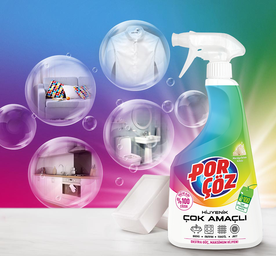 Mutfak ve Banyo Yüzeylerinde: Porçöz Çok Amaçlı Temizleyici'yi, kirli yüzey üzerine püskürtün ve daha sonra nemli bir bez veya sünger ile silin. Sildikten sonra yüzeyi su ile durulayın. Zor ve inatçı kirler için ürünü yüzey üzerinde 2-3 dakika bekletin.